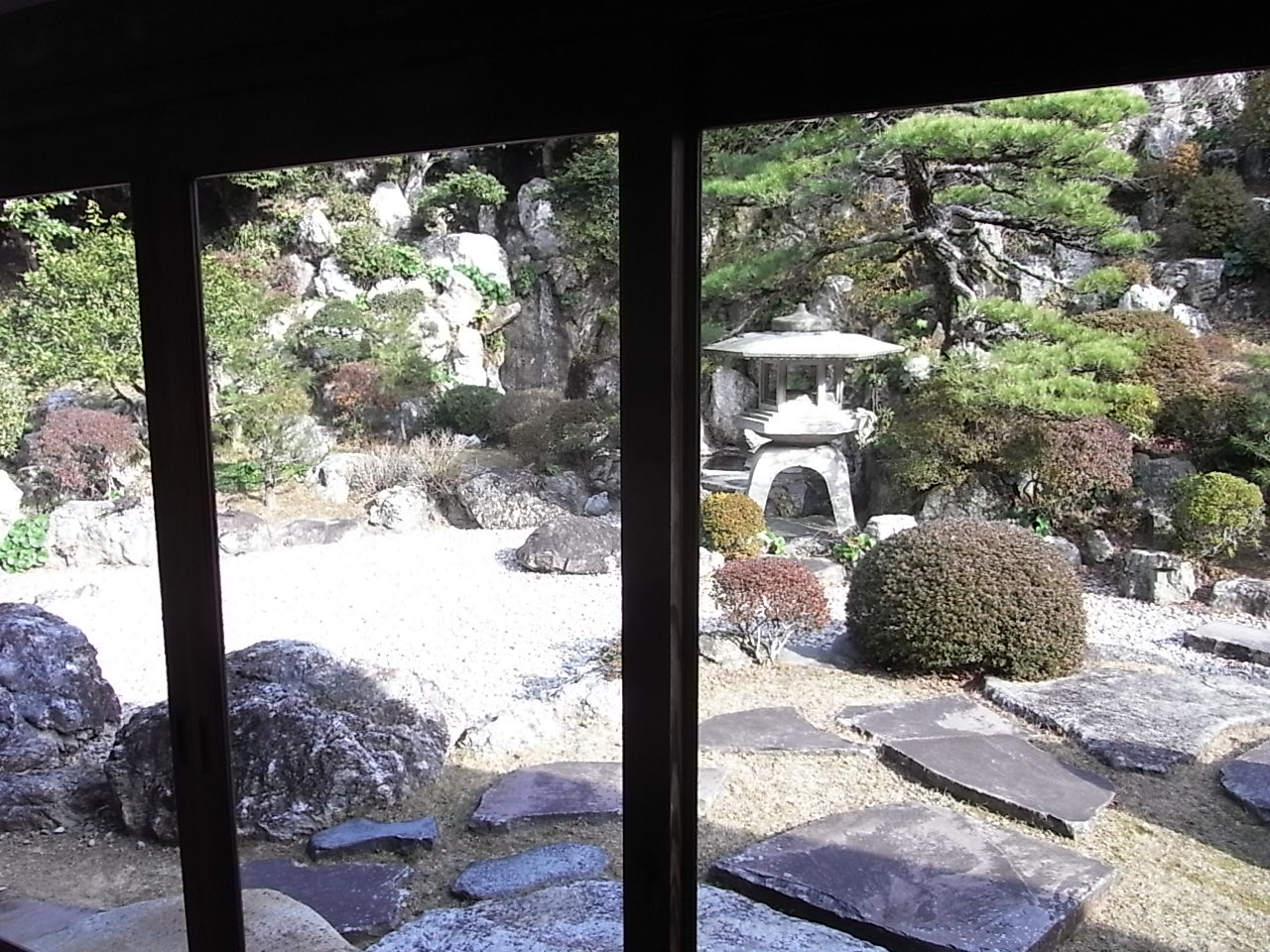 古く美しいガラス戸の外に広がる庭園。